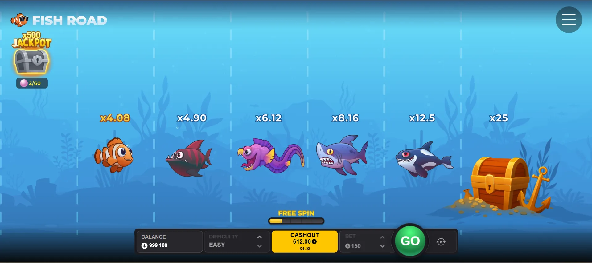 Fish Road ist ein Unterwasser‑Arcade‑Titel, bei dem Sie entlang eines Pfads beziehungsweise Wegs Entscheidungen treffen und mit jedem sicheren Schritt den Multiplikator steigern. Sie können jederzeit eine Auszahlung nehmen; endet eine Runde durch ein Raubtier‑Ereignis (z. B. Hai oder Piranha), verfällt der laufende Gewinn. Thematische Motive wie Fisch oder Clownfisch sind dekorativ; die verbindlichen Regeln finden Sie im Info‑Menü des Spiels.